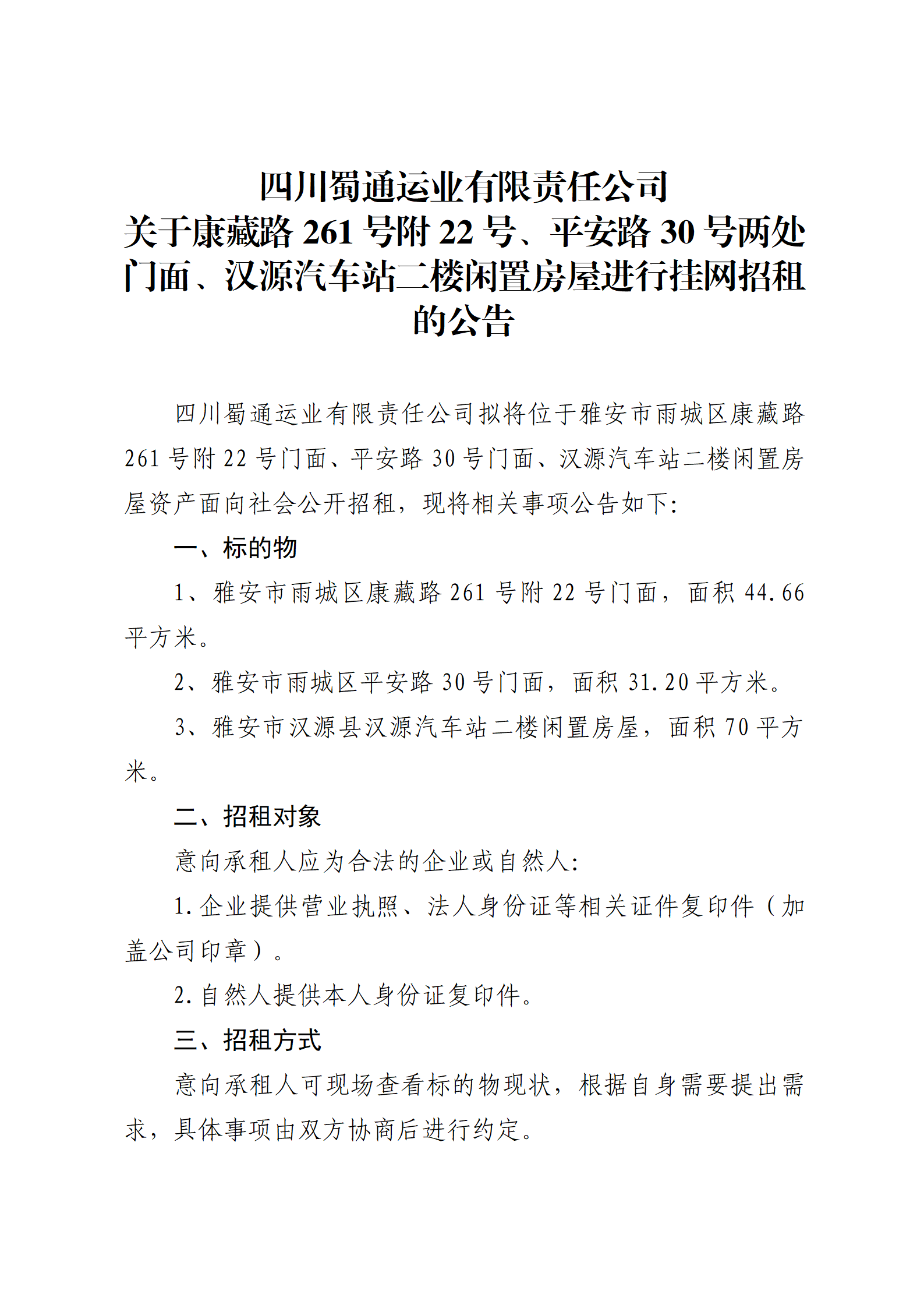 四川蜀通运业有限责任公司 关于康藏路261号附22号、平安路30号两处门面、汉源汽车站二楼闲置房屋进行挂网招租的公告