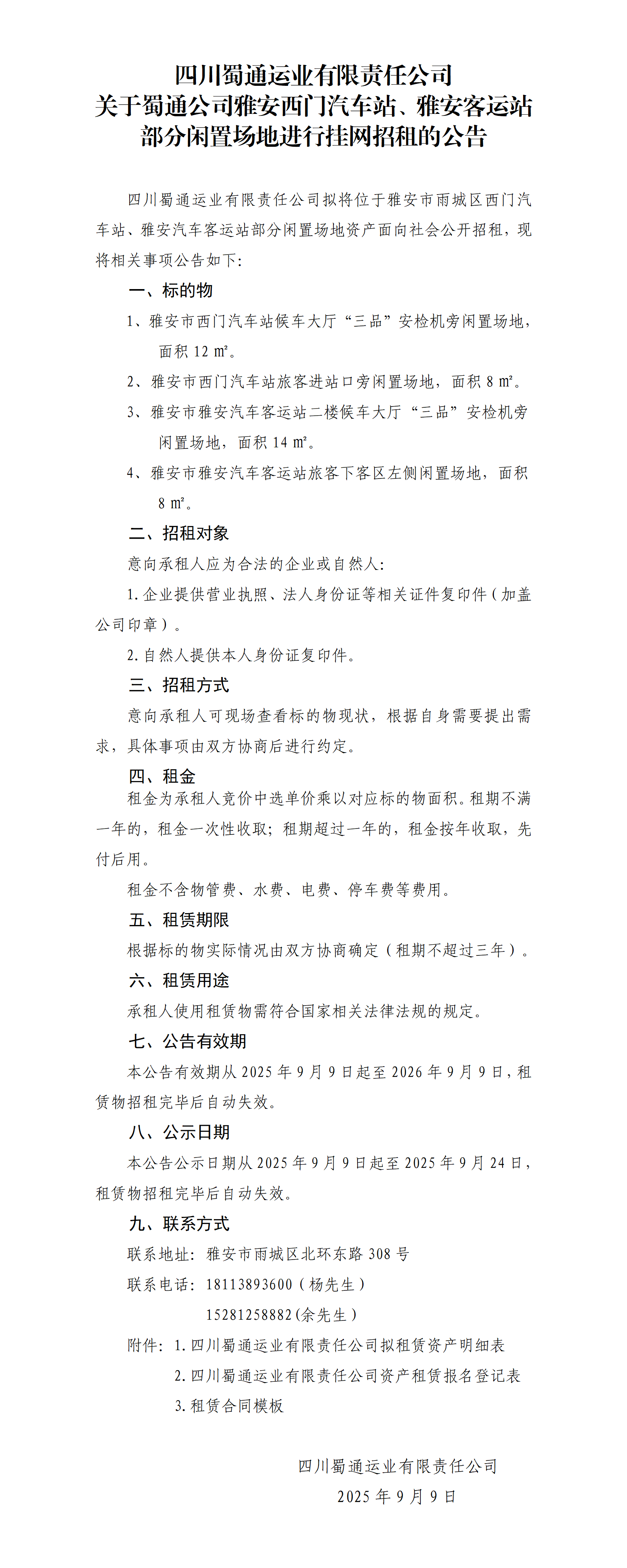 四川蜀通运业有限责任公司 关于蜀通公司雅安西门汽车站、雅安客运站部分闲置场地进行挂网招租的公告