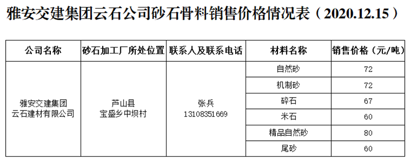 亿万先生MR集团云石公司砂石骨料销售价格情况表(2020.12.15)