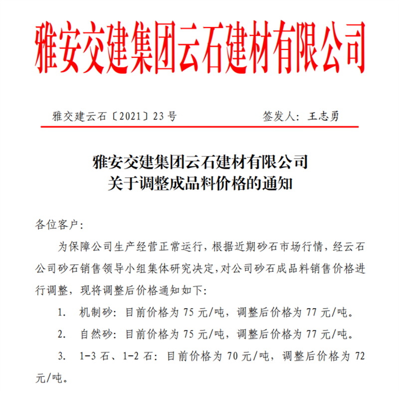 亿万先生MR集团云石公司砂石骨料销售价格情况表(2021.5.14)