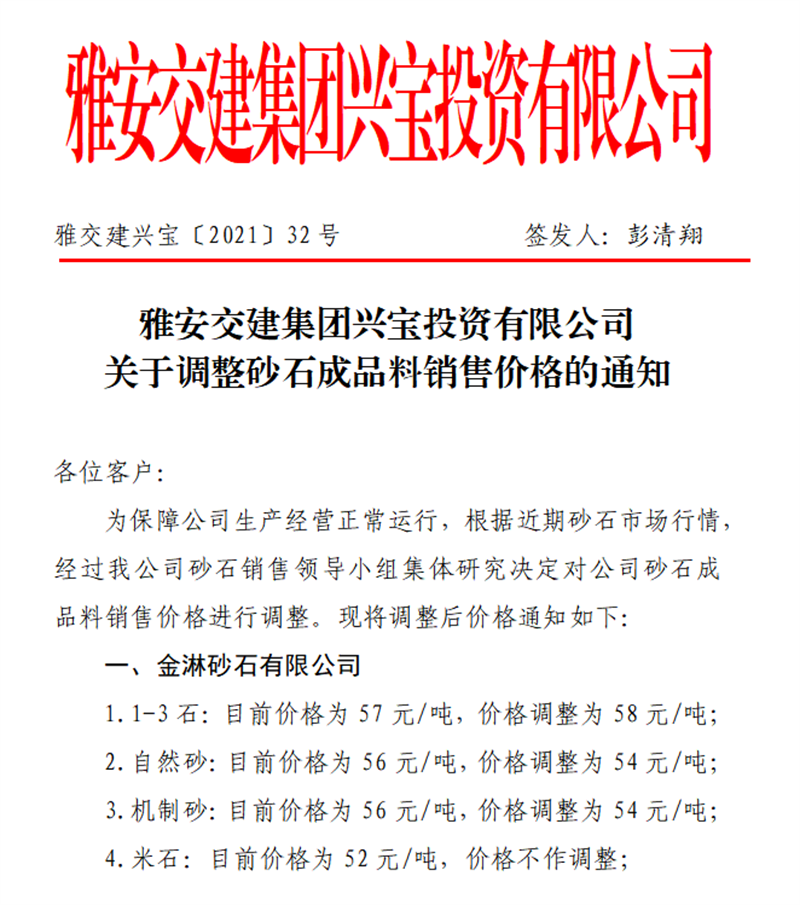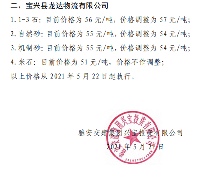 亿万先生MR集团兴宝公司砂石骨料销售价格情况表(2021.5.22)
