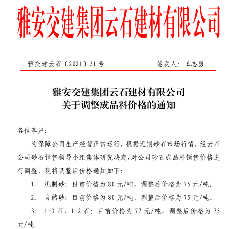 亿万先生MR集团云石公司砂石骨料销售价格情况表(2021.7.12)