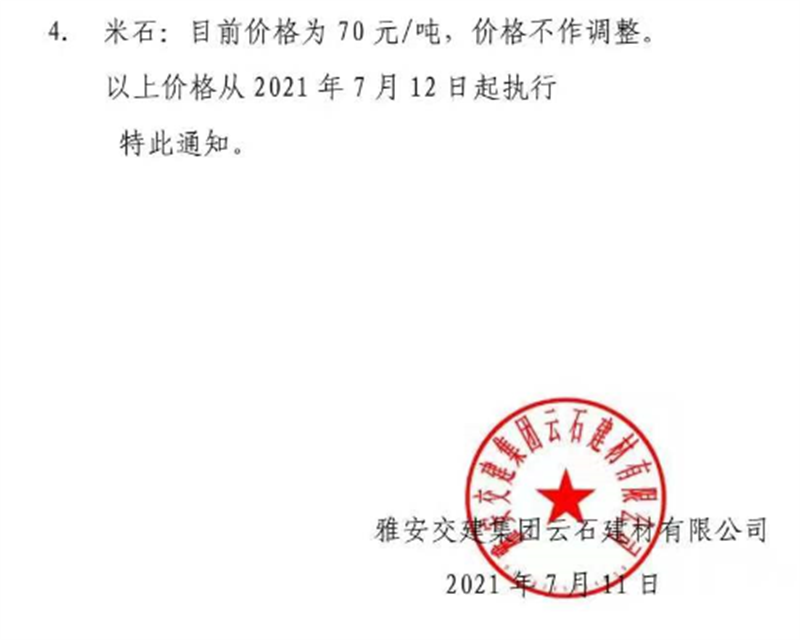 亿万先生MR集团云石公司砂石骨料销售价格情况表(2021.7.12)