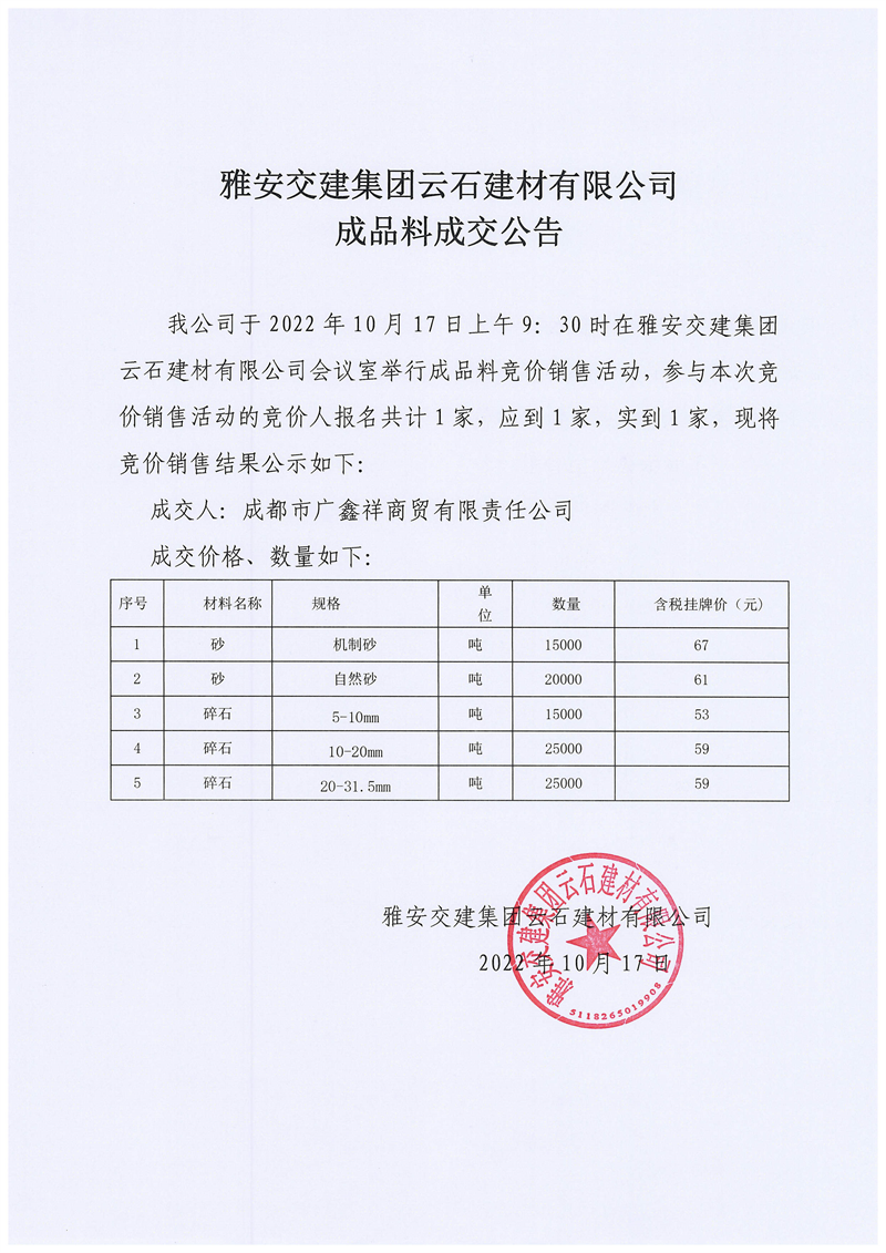 雅交建兴宝〔2022〕48号 关于调整砂石成品料销售价格的通知10.8