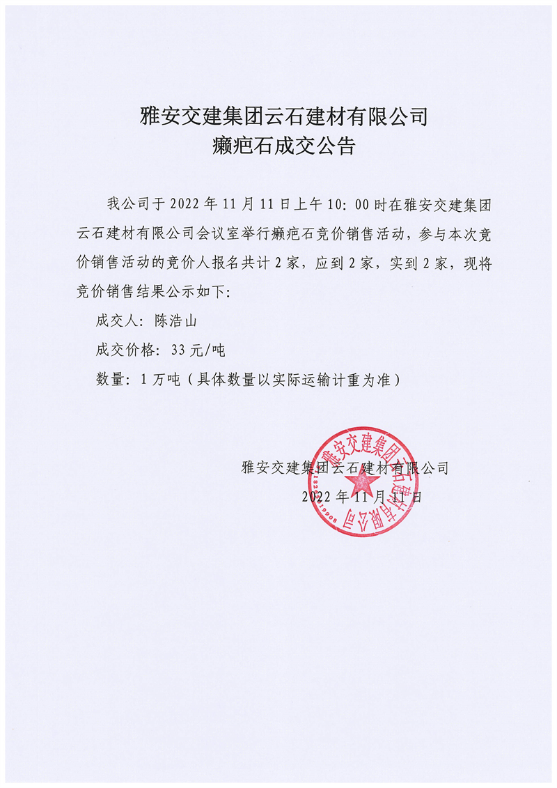 亿万先生MR集团云石建材有限公司癞疤石成交公告11.11