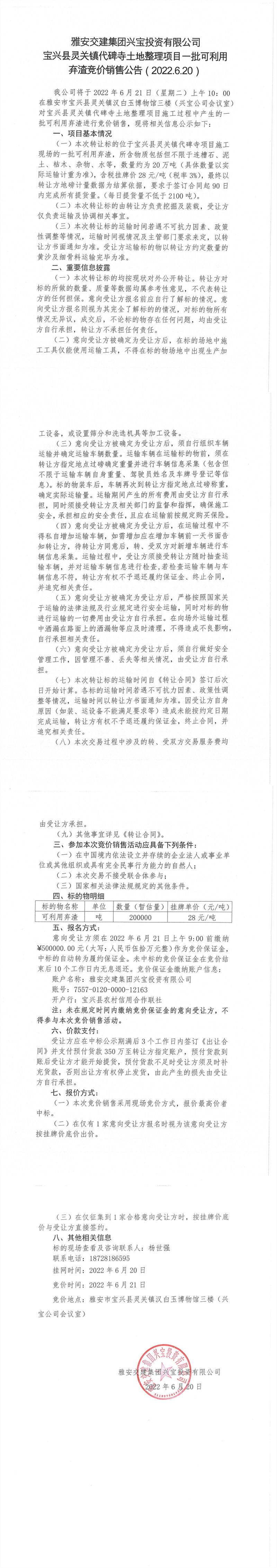 亿万先生MR集团兴宝投资有限公司宝兴县灵关镇代碑寺土地整理项目-批可利用 弃渣竞价销售公告( 2022.6.21)