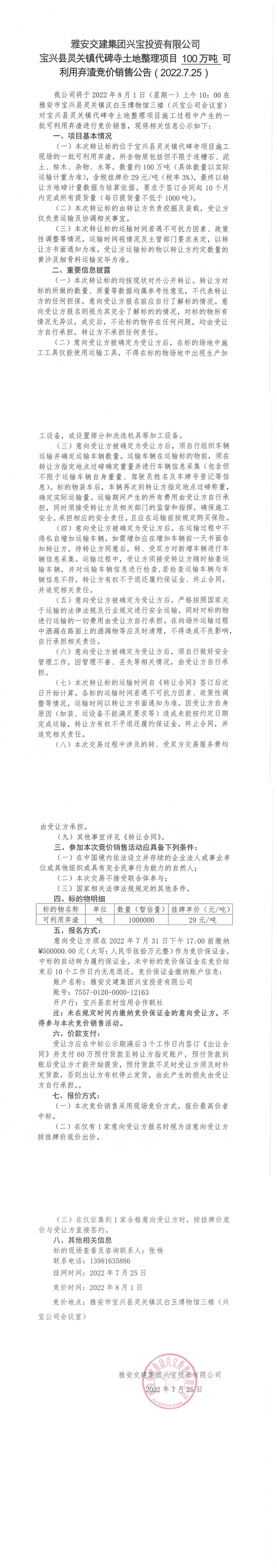 亿万先生MR集团兴宝投资有限公司宝兴县灵关镇代碑寺土地整理项目100万吨可利用弃渣竞价销售公告(2022.7.25)