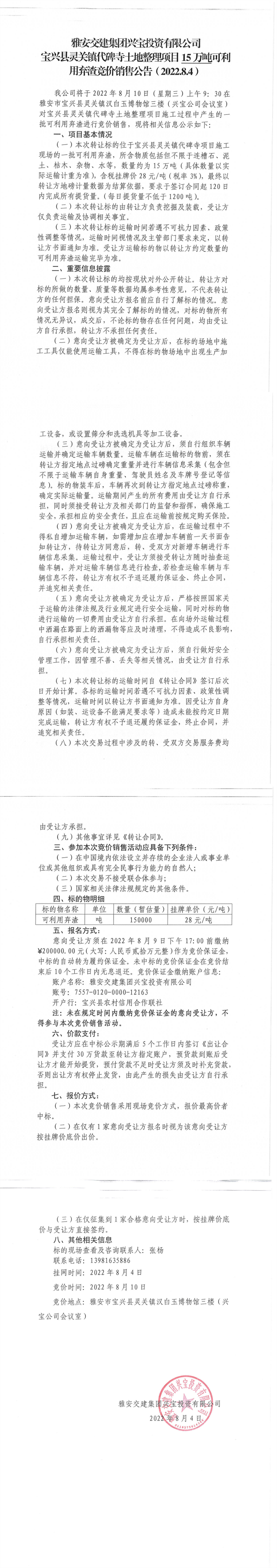 亿万先生MR集团兴宝投资有限公司灵关镇代碑寺土地整理项目15万吨可利用弃渣竞价销售公告(2022.8.4)