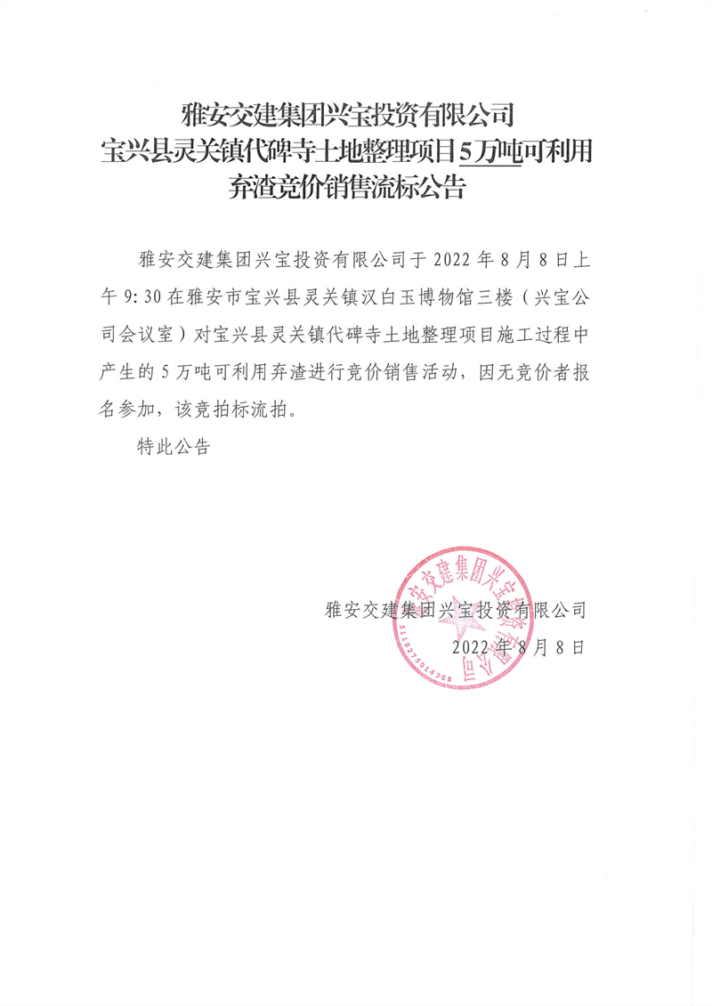 代碑寺土地整理项目5万吨可利用弃渣竞价销售流标公告