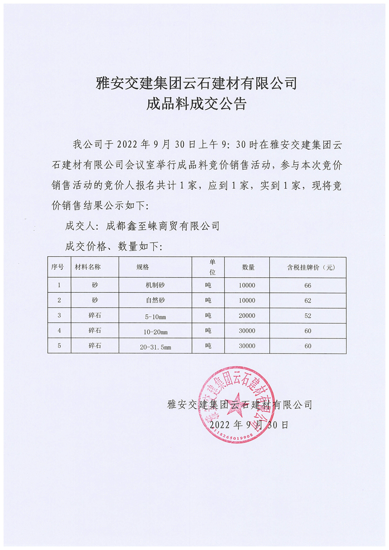 亿万先生MR集团云石建材有限公司成品料成交公告9.30