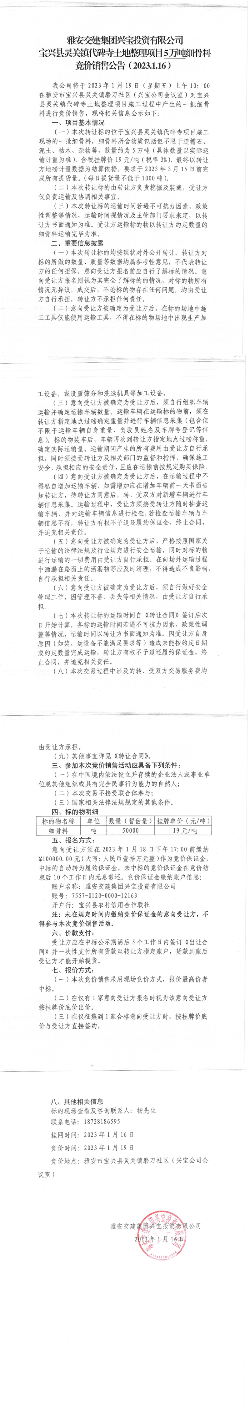 亿万先生MR集团兴宝投资有限公司宝兴县灵关镇代碑寺土地整理项目5万吨细骨料竞价销售公告(2023.01.16)