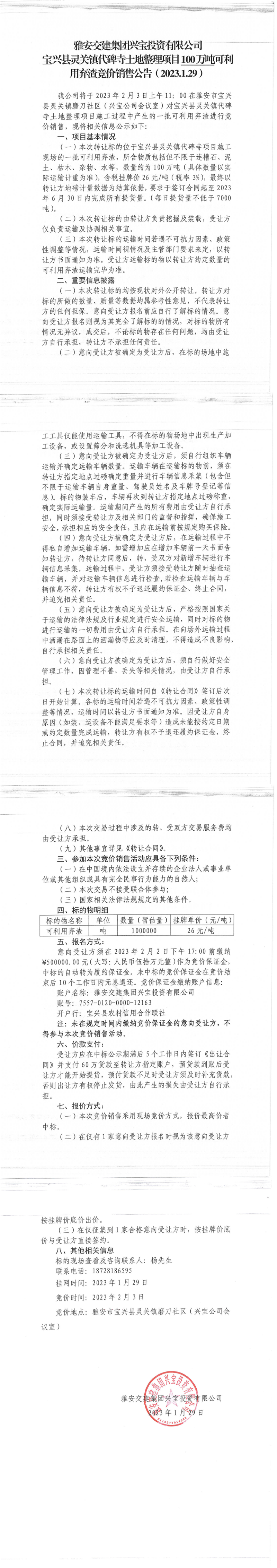 亿万先生MR集团兴宝投资有限公司灵关镇代碑寺土地整理项目100万吨可利用弃渣竞价销售公告(2023.1.29)