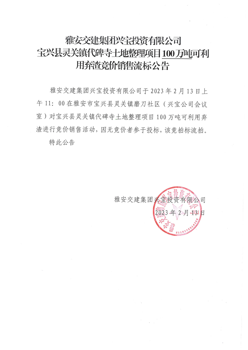 亿万先生MR集团兴宝投资有限公司100万吨可利用弃渣竞价销售流标公告(2023.2.13)
