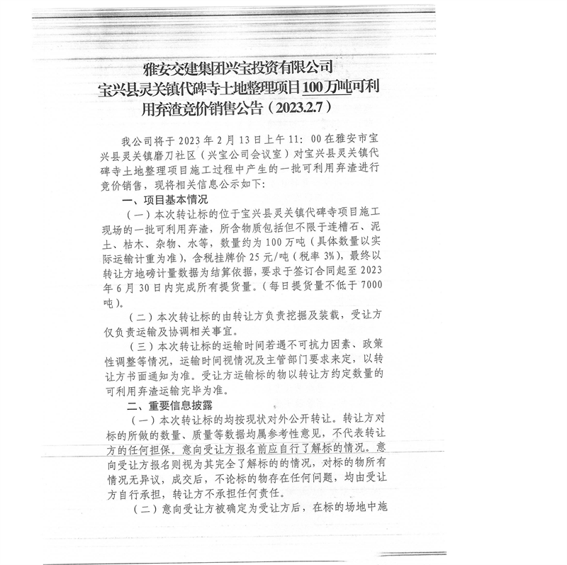 亿万先生MR集团兴宝投资有限公司灵关镇代碑寺土地整理项目100万吨可利用弃渣竞价销售公告(2023.2.7)