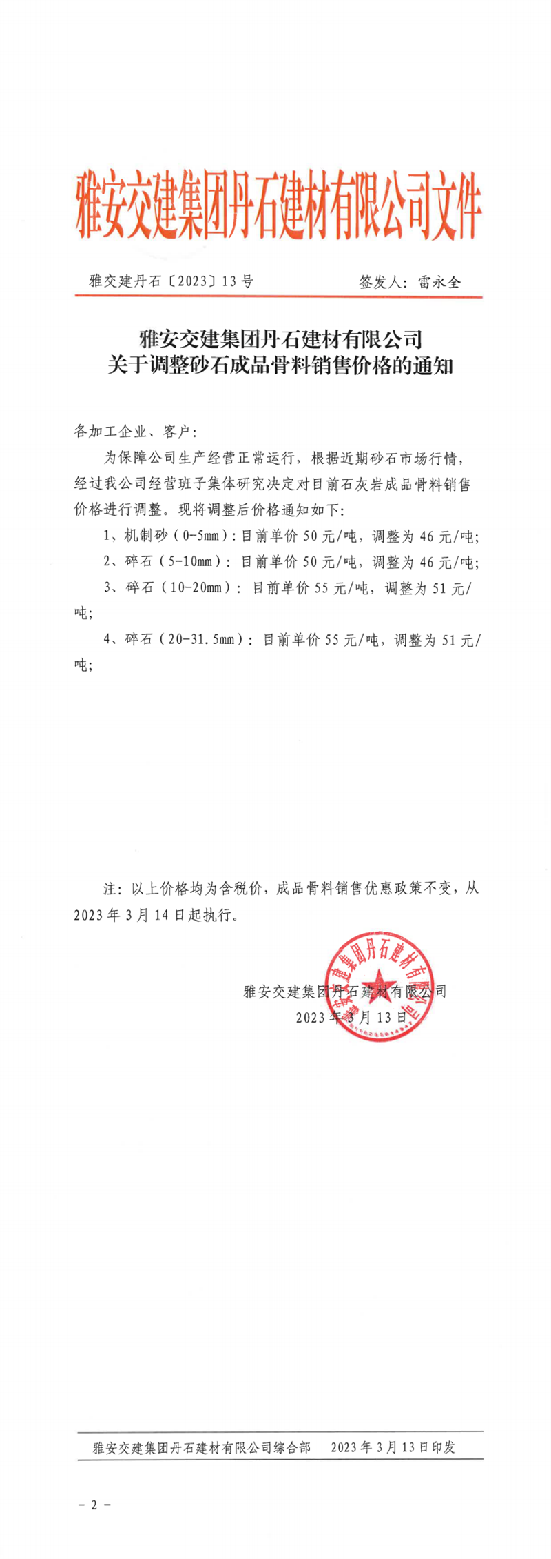 亿万先生MR集团兴宝投资有限公司关于调整成品料价格的通知(2023.03.13)