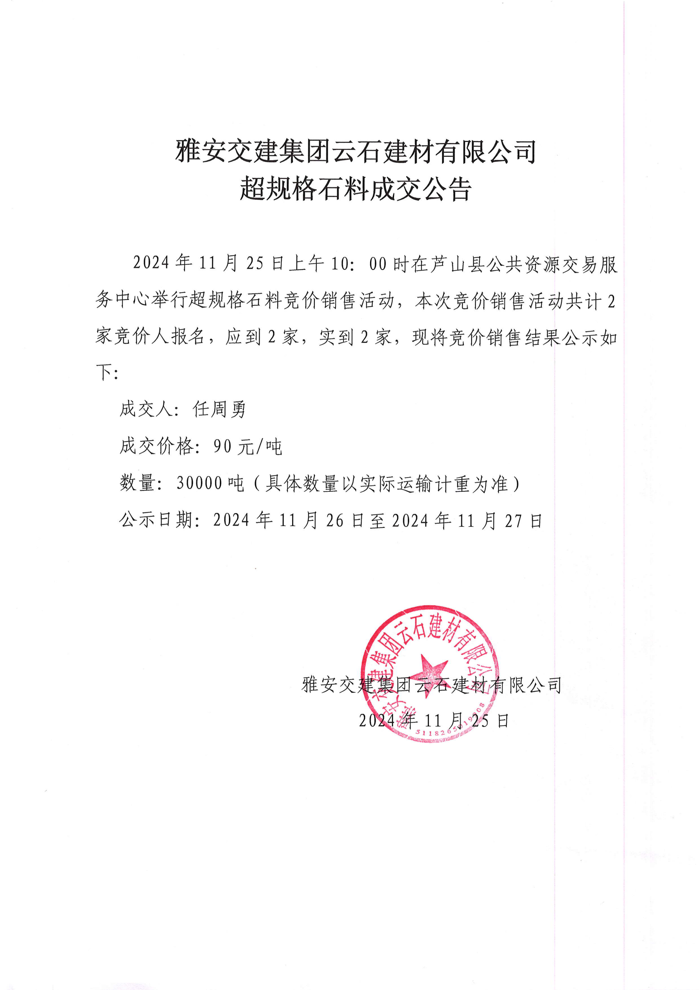 亿万先生MR集团云石建材有限公司超规格石料竞价销售成交公告(2024-11-26)