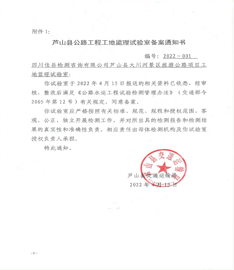近期,交建集团四川佳岳检测咨询有限公司芦山县大川河景区旅游公路项目监理试验室,顺利获得芦山县交通运输局备案验收,标志着佳岳公司芦山监理试验室对芦山县大川河景区旅游公路项目可以独立召开母体授权参数内的检测工作,出具相应的检测报告。
