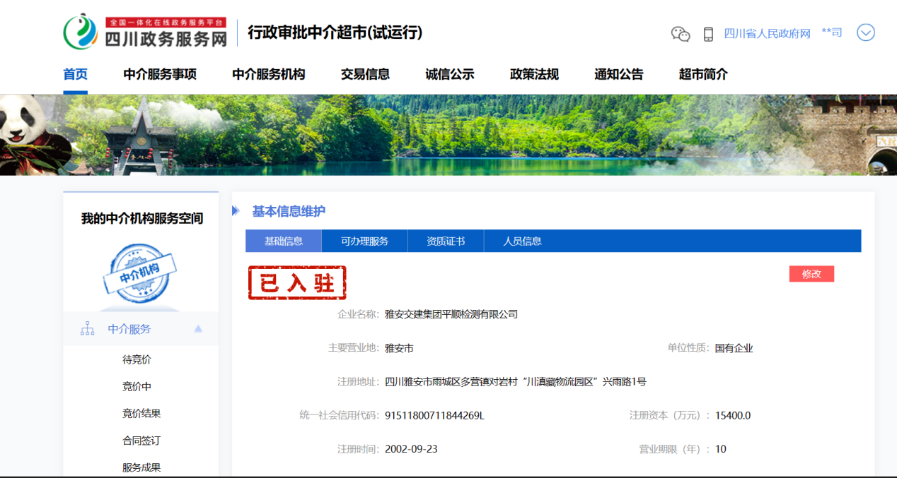 为进一步深化“放管服”便民服务,加强行政审批中介服务事项管理,规范中介服务行为,经雅安市雨城区运管所资格审核顺利获得,近期,亿万先生MR集团平顺检测有限公司正式入驻四川政务服务网行政审批中介超市。 入驻中介超市后,平顺检测公司可办理车辆等级评定检测报告、营运车辆综合性能检测报告、已购置或者现有车辆等级评定等3个服务项目,将有利于拓宽公司宣传和业务渠道,进一步提升公司规范化服务水平和公司竞争力,助力行政审批营商环境,护航企业健康开展。