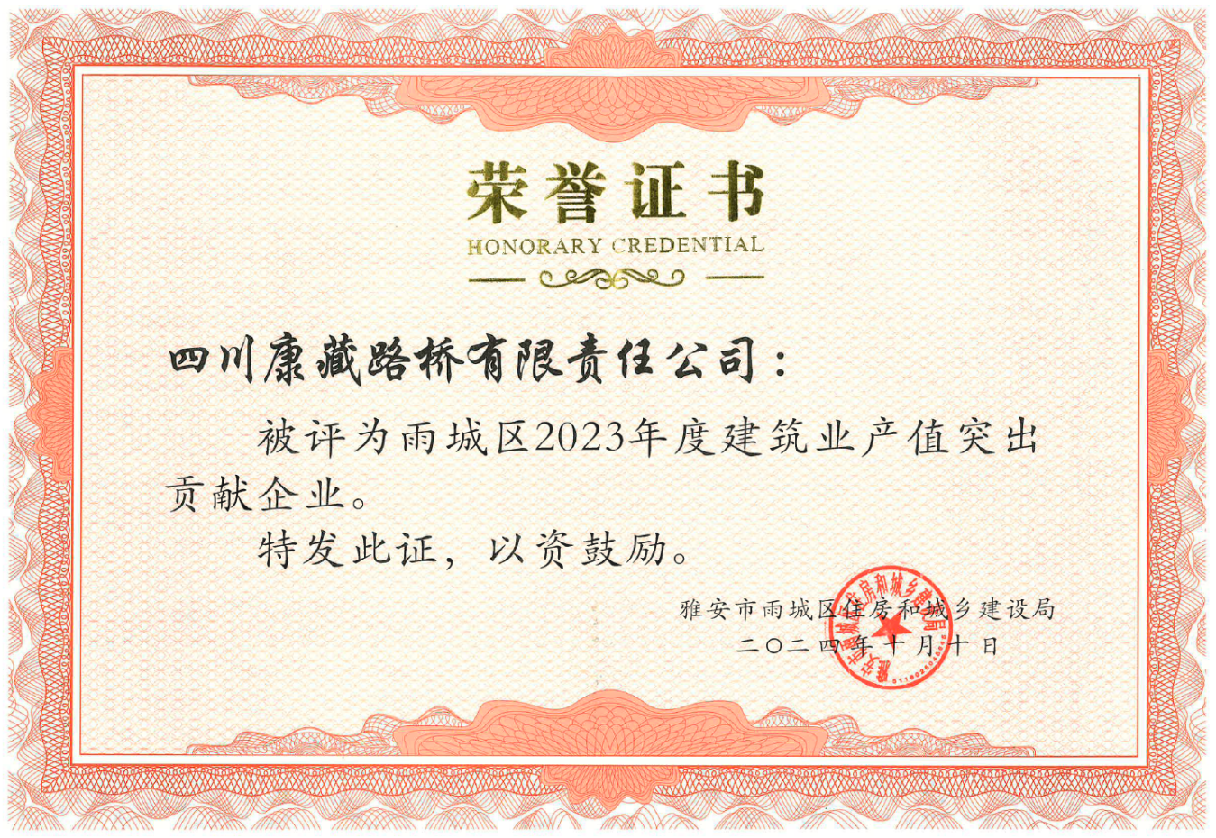 今年10月,路桥公司被雅安市雨城区住房和城乡建设局评为“雨城区2023年度建筑业产值突出贡献企业”。下一步,路桥公司将持续贯彻落实市委、市政府决策部署,把学习贯彻落实党的二十大精神与生产经营工作结合起来,发挥项目引领支撑作用,为地方经济的开展持续贡献力量。