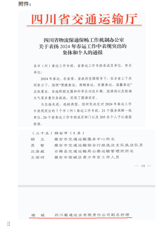 近期,交建集团蜀通公司副总经理谢斌获四川省交通运输厅2024年春运工作表现突出通报表扬。