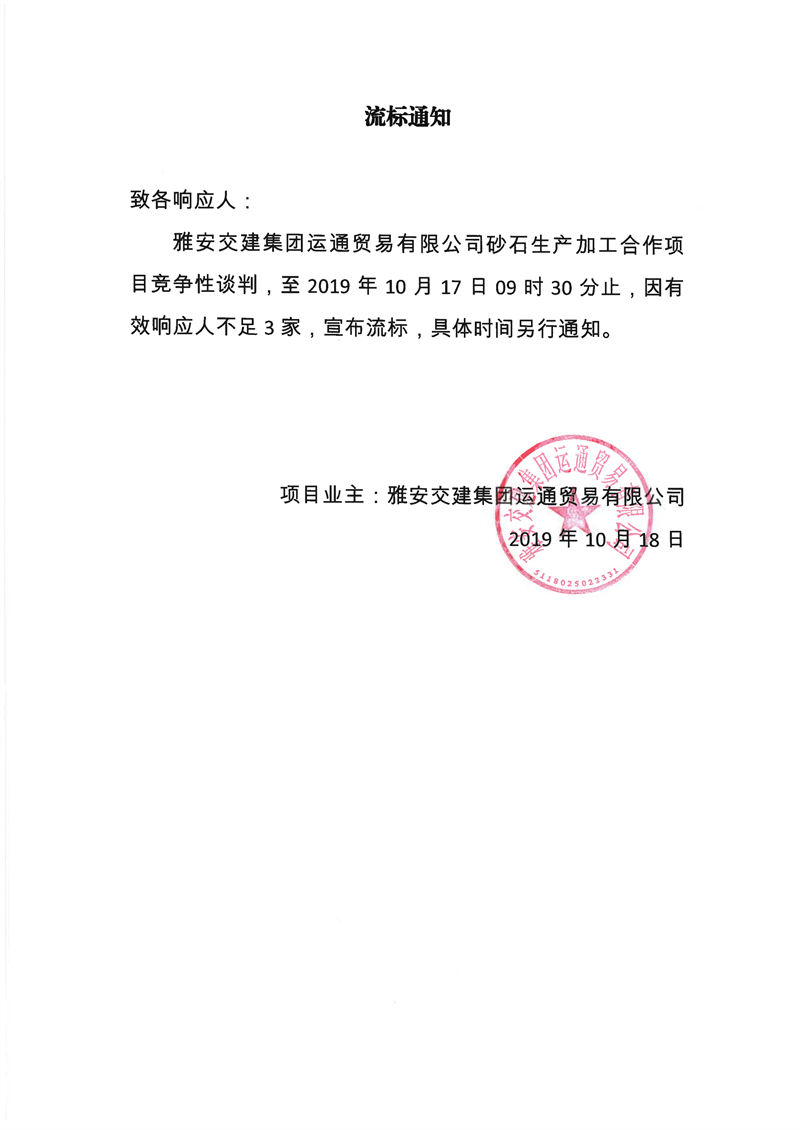 亿万先生MR集团运通贸易有限公司砂石生产加工合作项目流标通知