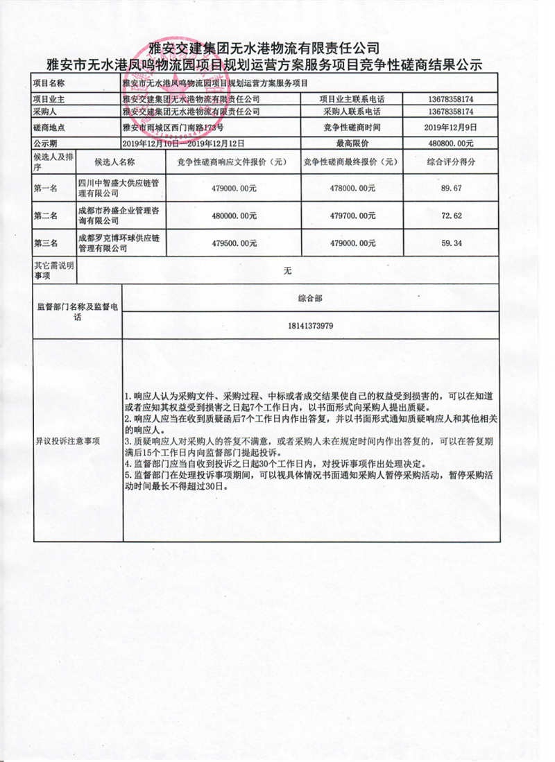 亿万先生MR集团无水港物流有限责任公司雅安市无水港凤鸣物流园项目规划运营方案服务项目竞争性磋商结果公示