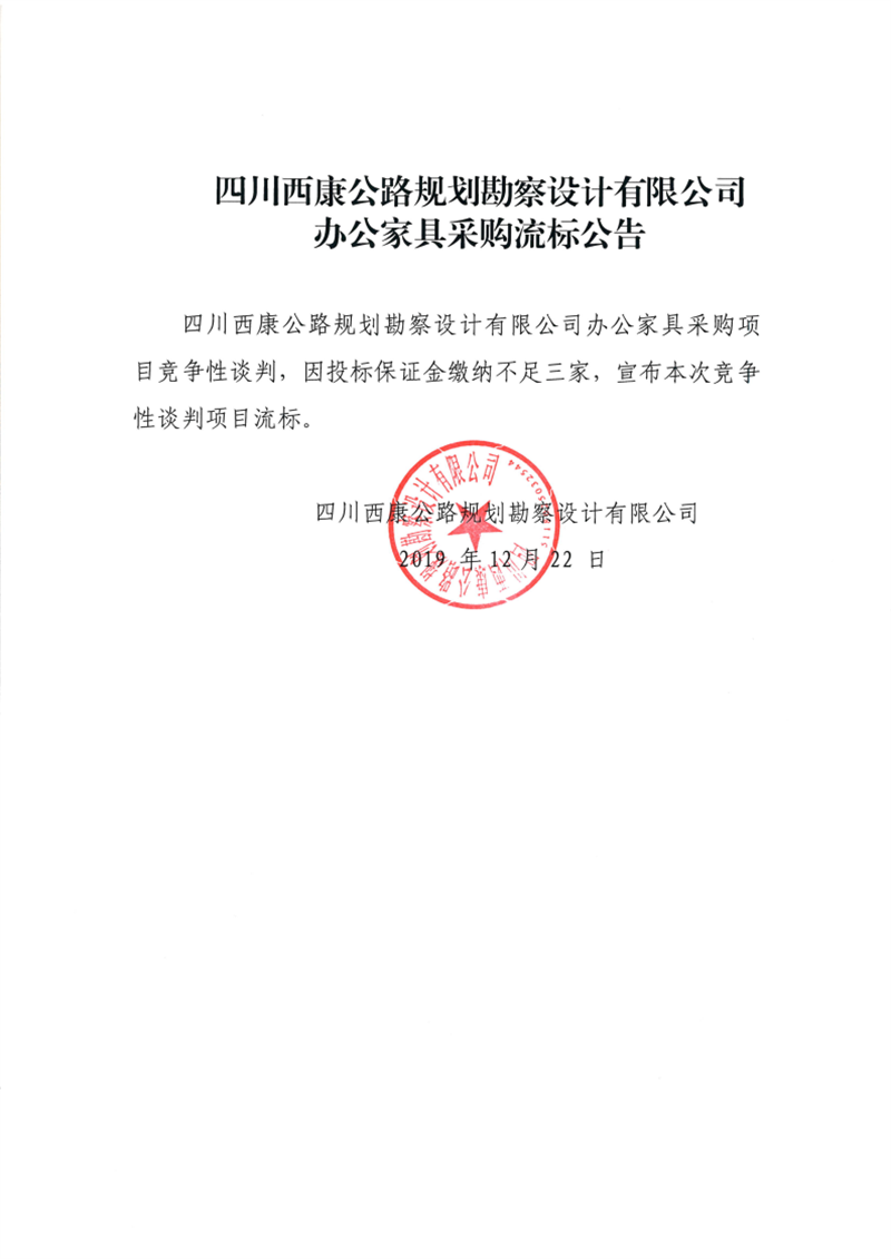 四川西康公路规划勘察设计有限公司办公家具采购流标公告