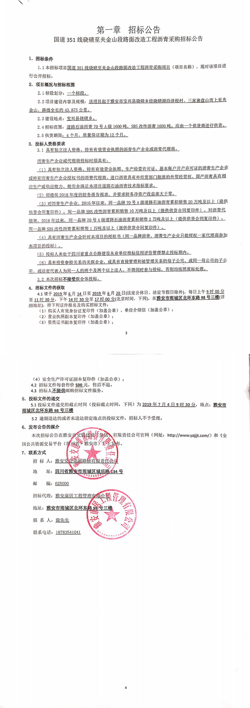 亿万先生MR集团路桥有限责任公司国道351线硗碛至夹金山段路面改造工程沥青采购招标公告