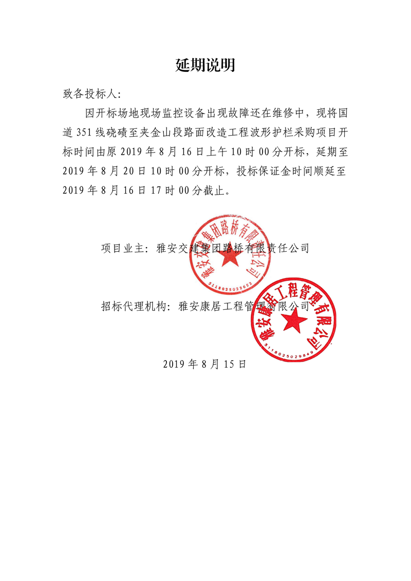 亿万先生MR集团路桥有限责任公司国道351线硗碛至夹金山段路面改造工程波形护栏采购延期说明