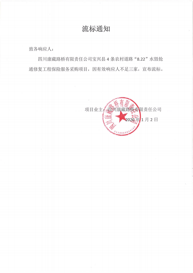 四川康藏路桥有限责任公司宝兴县4条农村道路“8.22”水毁抢通修复工程保险服务采购项目流标通知