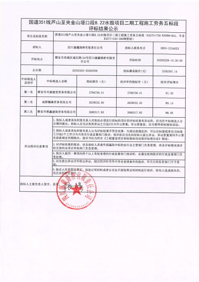 四川康藏路桥有限责任公司国道351线芦山至夹金山垭口段8.22水毁项目二期工程施工劳务五标段评标结果公示
