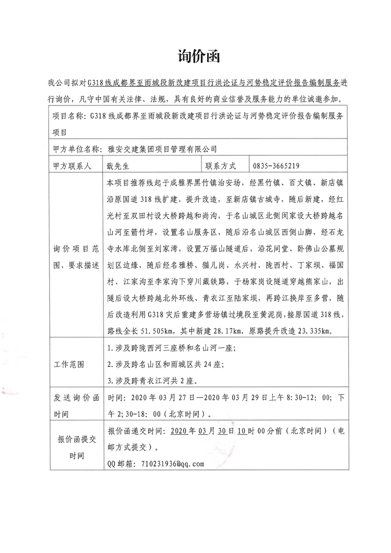 亿万先生MR集团项目管理有限公司G318线成都界至雨城段新改建项目行洪论证与河势稳定评价报告编制服务项目询价函