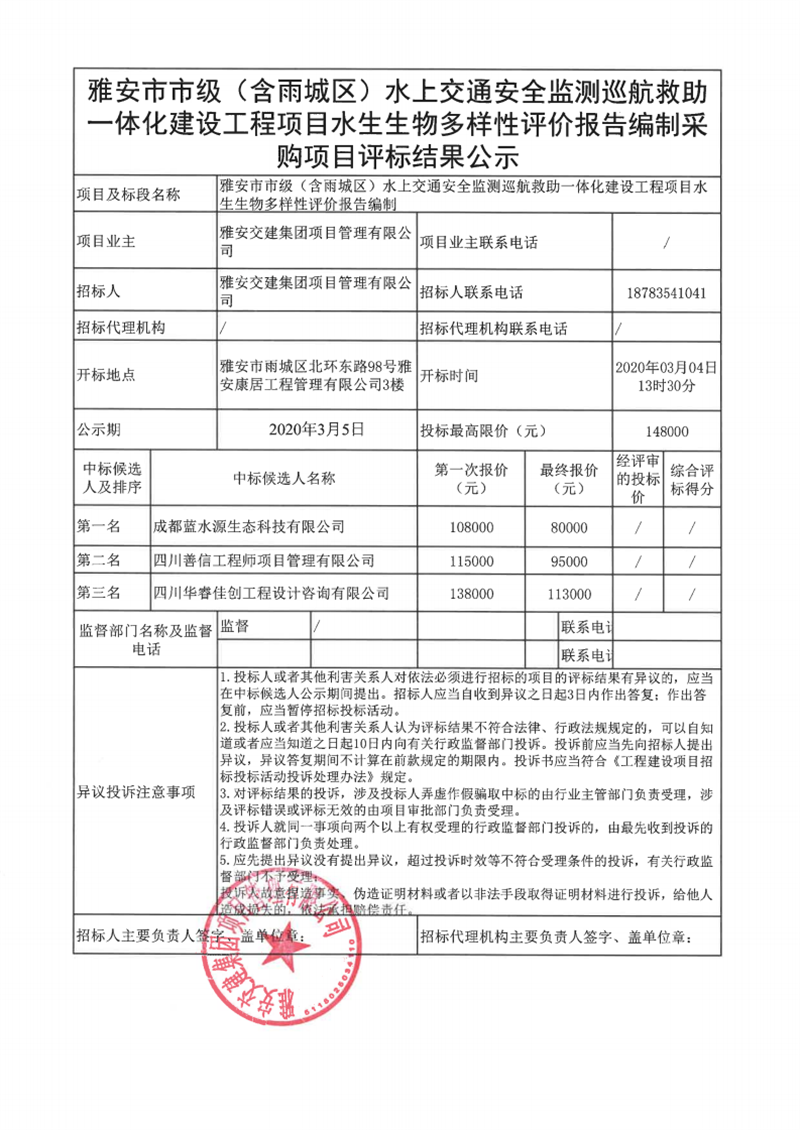 亿万先生MR集团项目管理有限公司雅安市市级(含雨城区)水上交通安全监测巡航救助一体化建设工程项目水生生物多样性评价报告编制采购项目评标结果公示