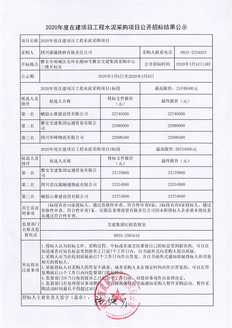 四川康藏路桥有限责任公司2020年度在建项目工程水泥采购项目公开招标结果公示
