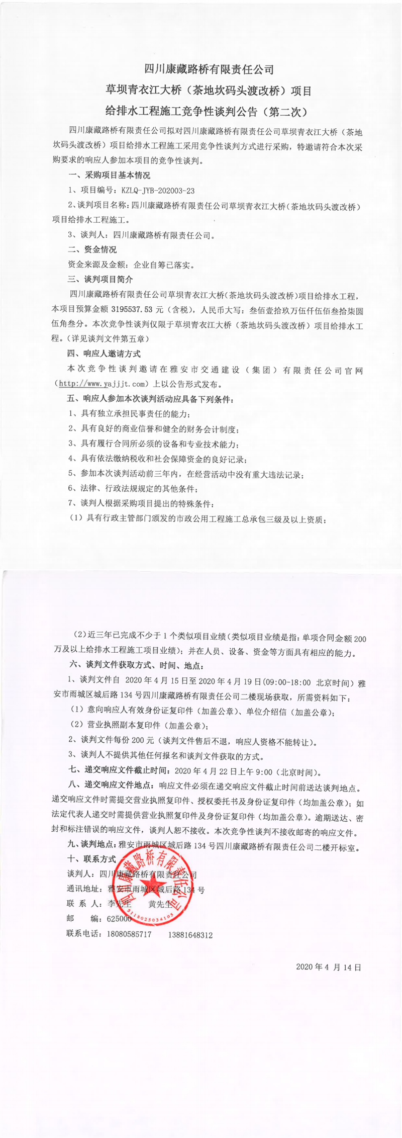 四川康藏路桥有限责任公司草坝青衣江大桥(茶地坎码头渡改桥)项目给排水工程施工竞争性谈判公告(第二次)