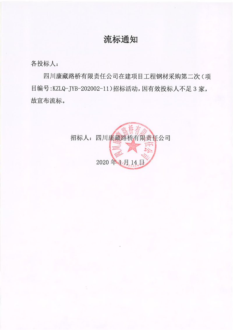 四川康藏路桥有限责任公司在建项目工程钢材采购第二次流标通知