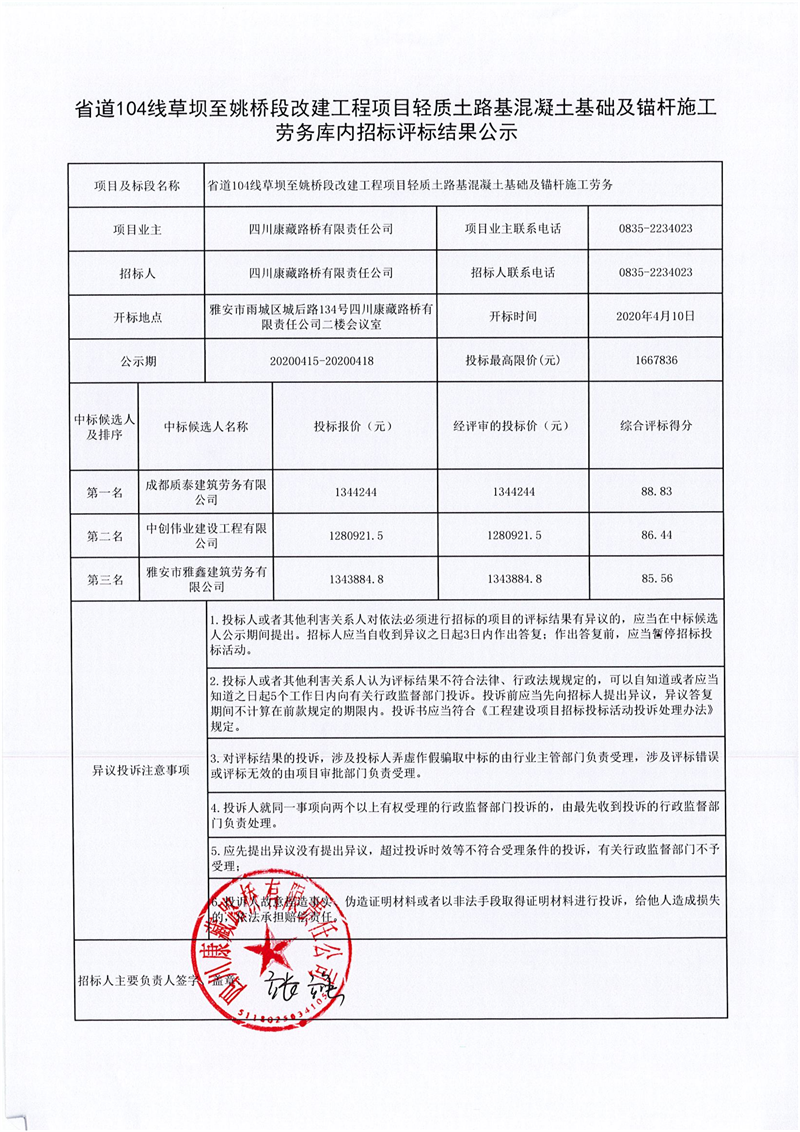 四川康藏路桥有限责任公司省道104线草坝至姚桥段改建工程项目轻质土路基混凝土基础及锚杆施工劳务库内招标评标结果公示