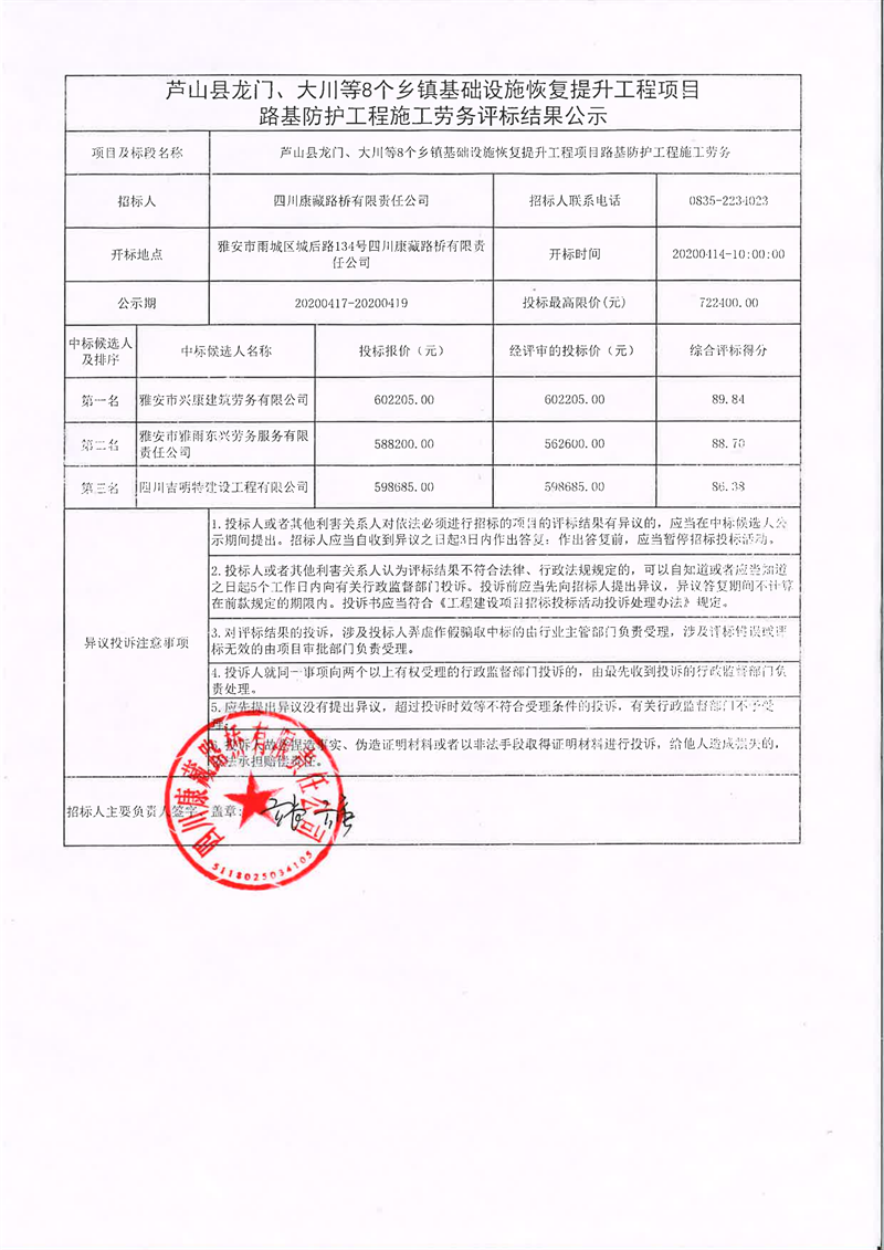 四川康藏路桥有限责任公司芦山县龙门、大川等8个乡镇基础设施恢复提升工程项目路基防护工程施工劳务评标结果公示