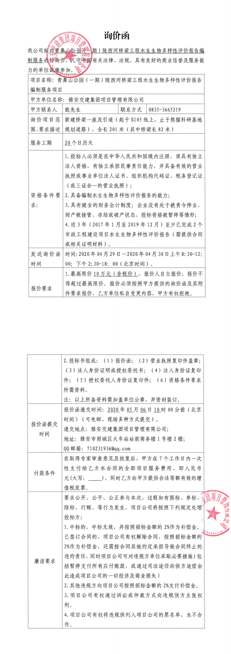 亿万先生MR集团项目管理有限公司青鼻山公园(一期)陇西河桥梁工程水生生物多样性评价报告编制服务项目询价函
