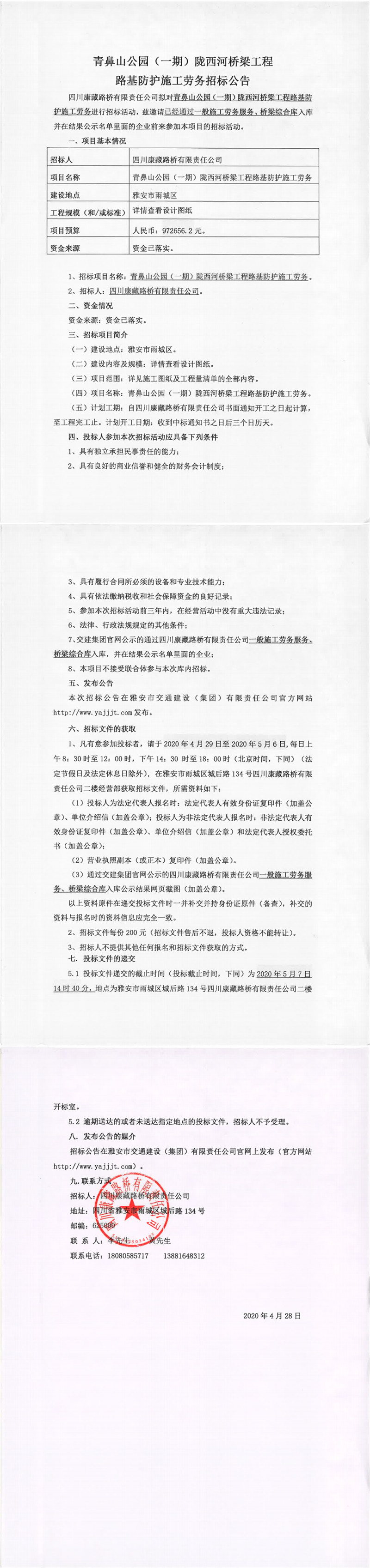 四川康藏路桥有限责任公司青鼻山公园(一期)陇西河桥梁工程路基防护施工劳务招标公告