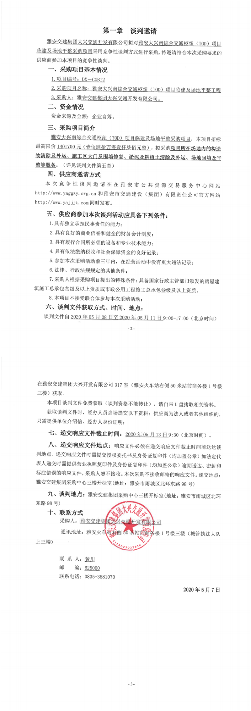 亿万先生MR集团大兴交通开发有限公司雅安大兴南综合交通枢纽(TOD)项目临建及场地平整工程竞争性谈判公告