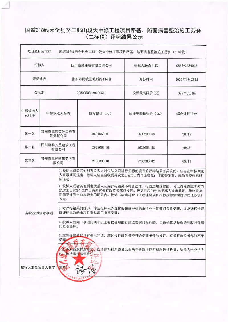 四川康藏路桥有限责任公司国道318线天全县至二郎山段大中修工程项目路基、路面病害整治施工劳务(二标段)评标结果公示