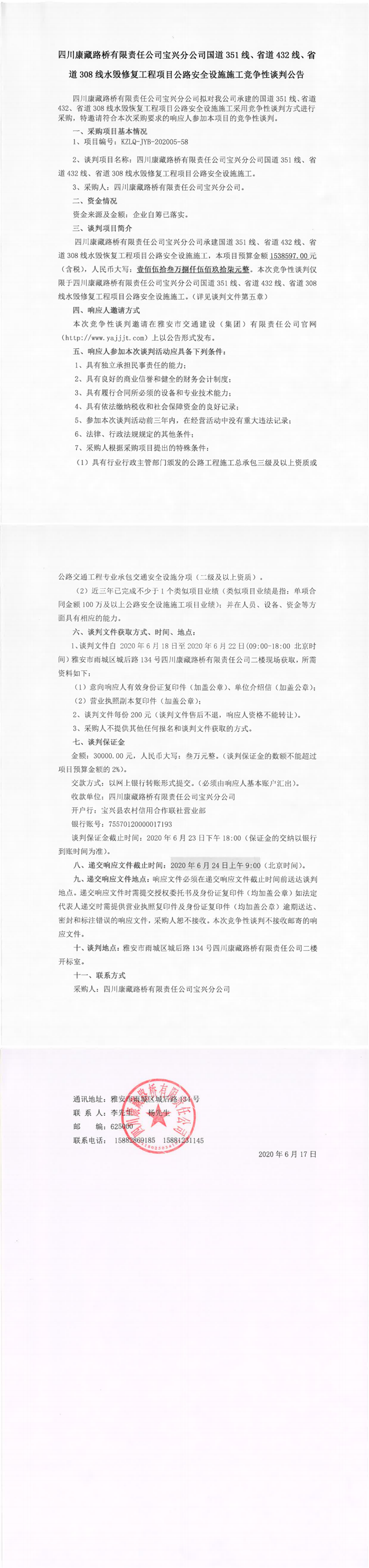 四川康藏路桥有限责任公司宝兴分公司国道351线、省道432线、省道308线水毁修复工程项目公路安全设施施工竞争性谈判公告