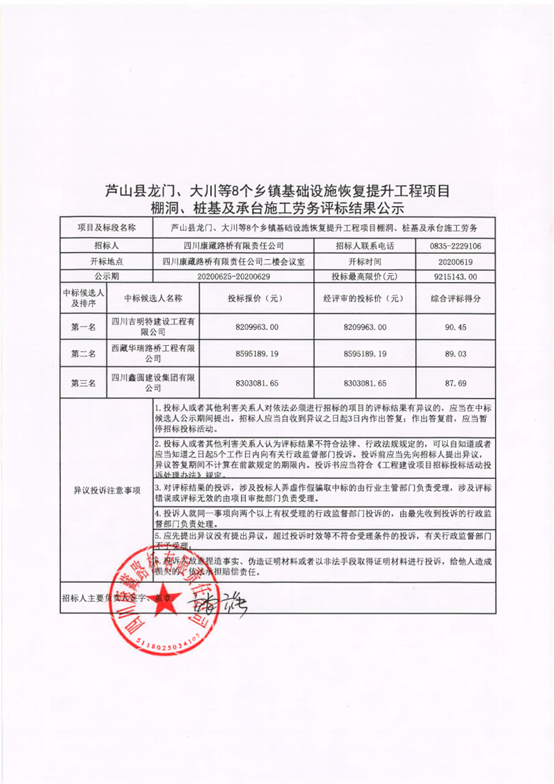 四川康藏路桥有限责任公司芦山县龙门、大川等8个乡镇基础设施恢复提升工程项目棚洞、桩基及承台施工劳务评标结果公示