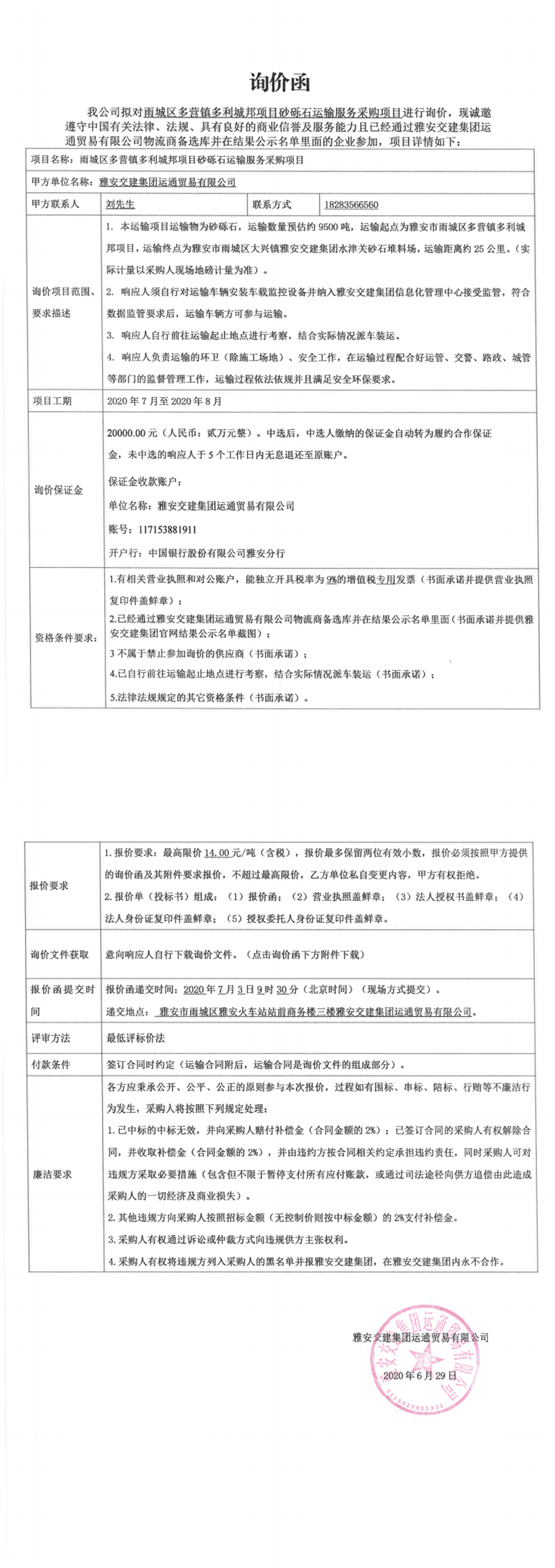 亿万先生MR集团运通贸易有限公司雨城区多营镇多利城邦项目砂砾石运输服务采购项目询价函