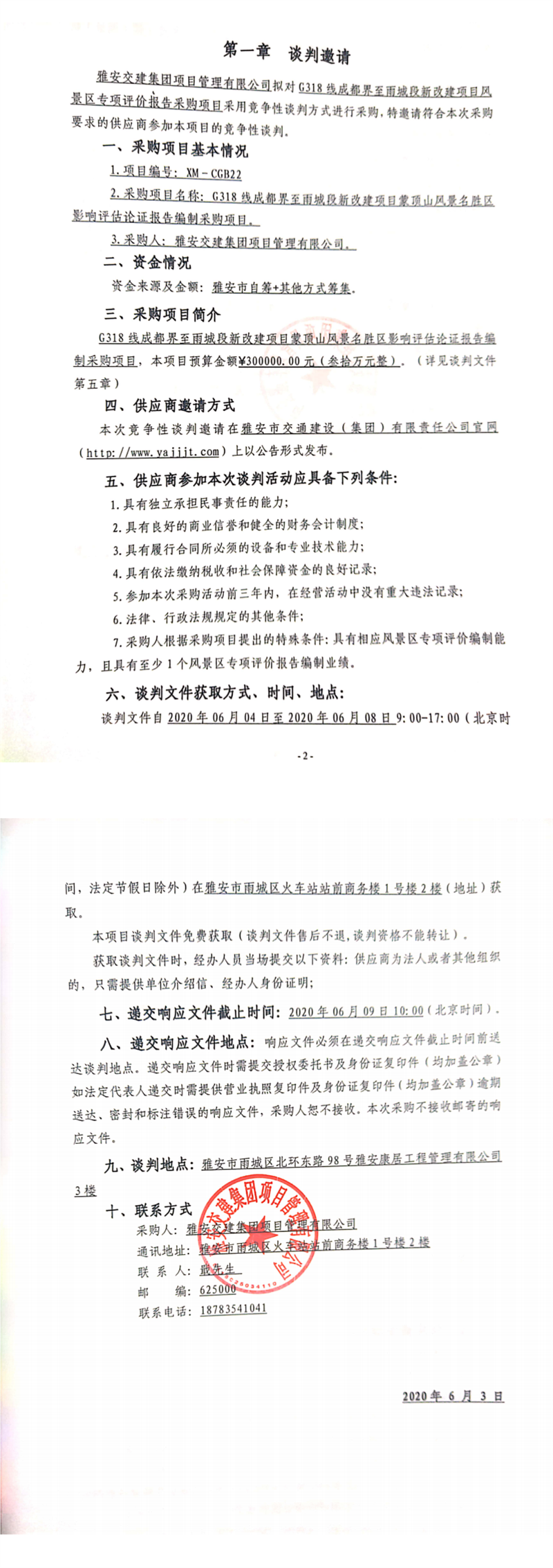 亿万先生MR集团项目管理有限公司G318线成都界至雨城段新改建项目蒙顶山风景名胜区影响评估论证报告编制采购项目竞争性谈判公告