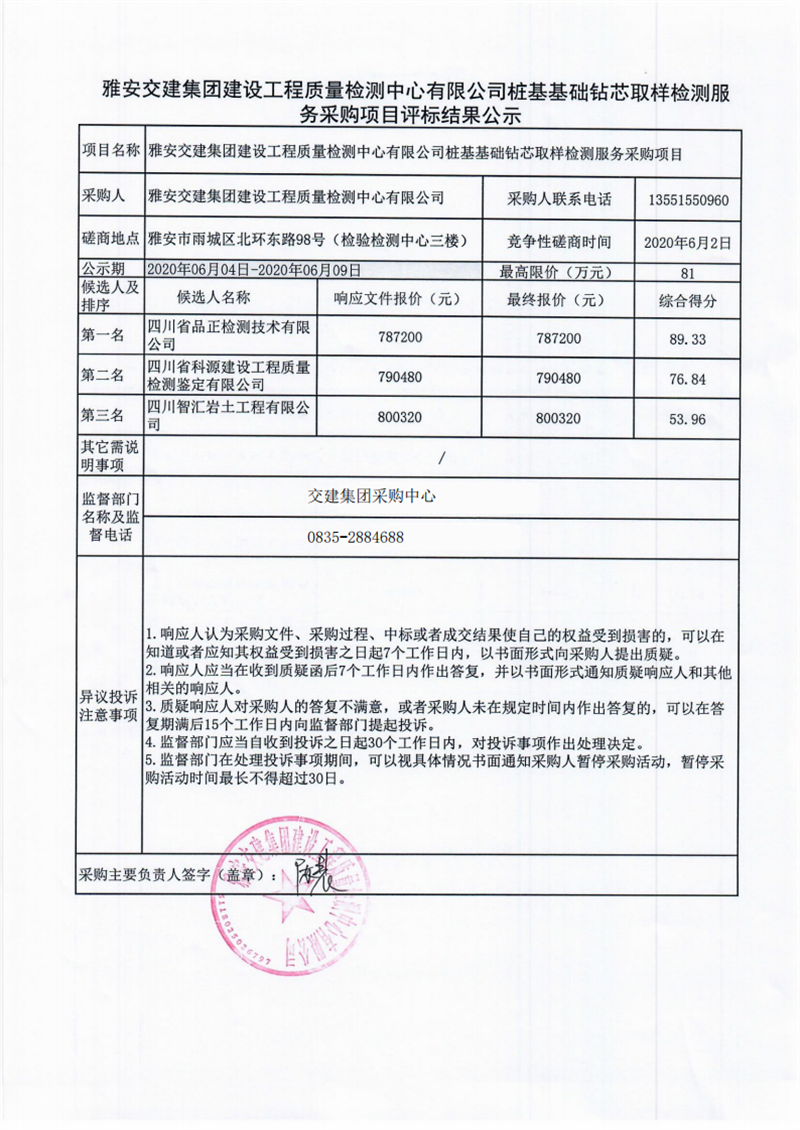 亿万先生MR集团建设工程质量检测中心有限公司桩基基础钻芯取样检测服务采购项目评标结果公示