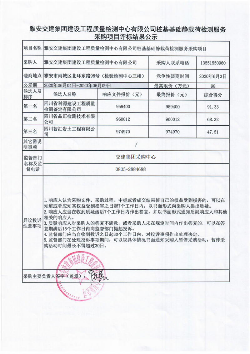 亿万先生MR集团建设工程质量检测中心有限公司桩基基础静载荷检测服务采购项目评标结果公示