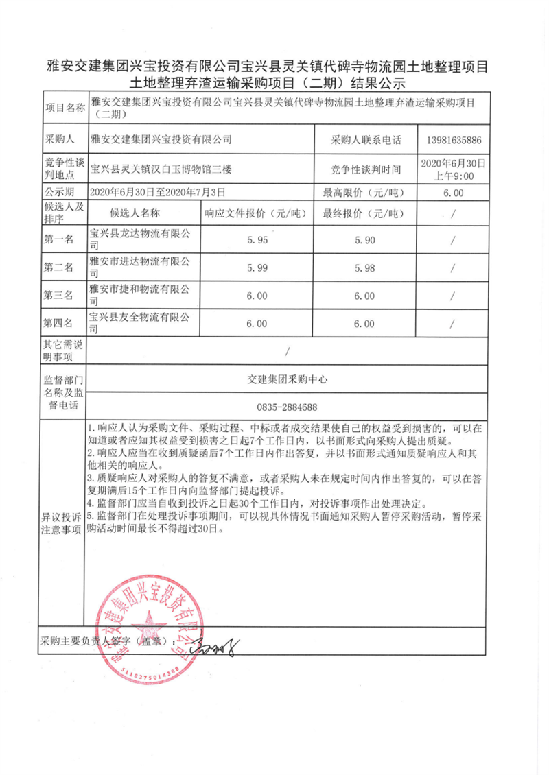 亿万先生MR集团兴宝投资有限公司宝兴县灵关镇代碑寺物流园土地整理项目土地整理弃渣运输采购项目(二期)结果公示