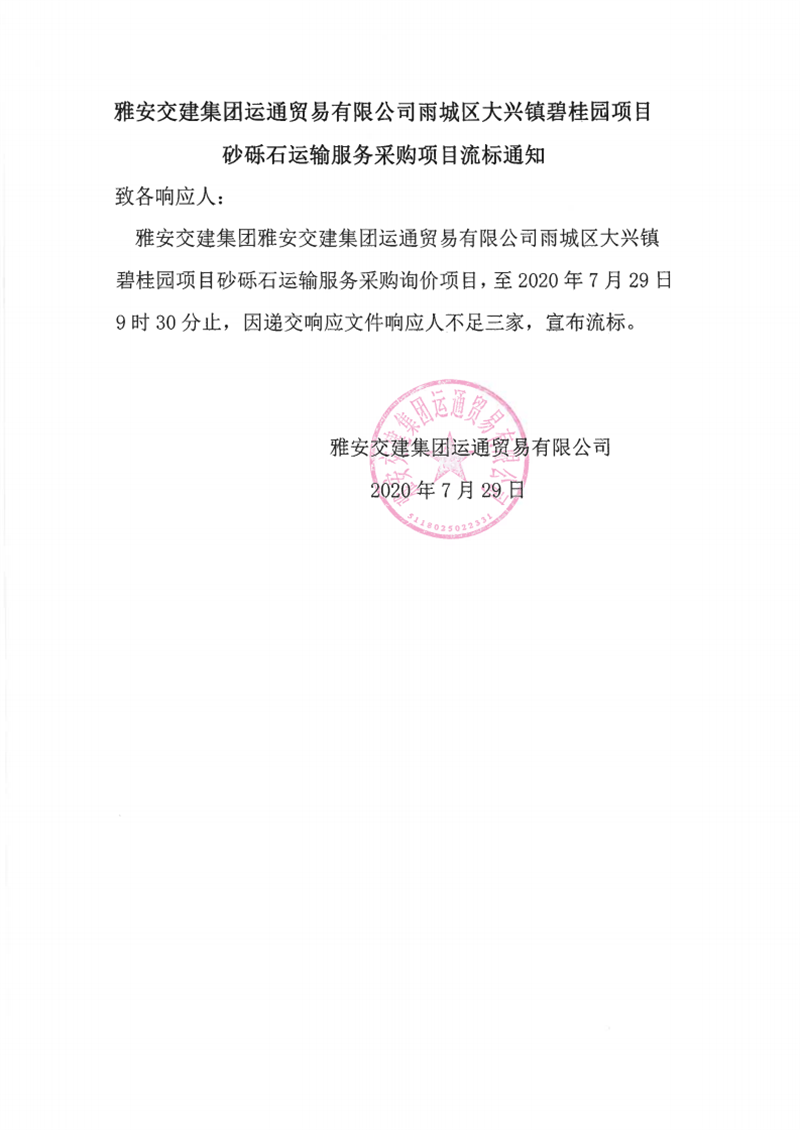 亿万先生MR集团运通贸易有限公司雨城区大兴镇碧桂园砂砾石运输服务采购项目流标通知